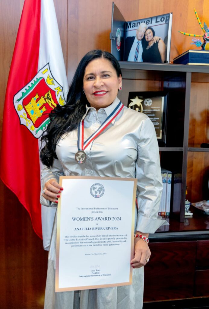 The International Parliament of Education, (Parlamento Internacional de Educación IPE), organismo no lucrativo con sede en Texas, que tiene como finalidad reconocer y promover el esfuerzo educativo a nivel global para afianzar la calidad académica que merecen las futuras generaciones, nominó a la Senadora Ana Lilia Rivera Rivera, presidenta del Senado de la República, por sus méritos profesionales y personales a recibir el Reconocimiento a la Mujer 2024, como símbolo de que ha dado testimonio a la encomiable labor como promotora de la inclusión de la mujer en puestos públicos que benefician a las futuras generaciones de niñas y jóvenes.