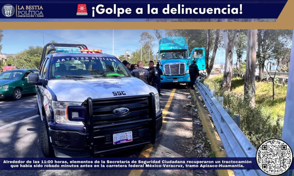 Alrededor de las 11:00 horas, elementos de la Secretaría de Seguridad Ciudadana recuperaron un tractocamión que había sido robado minutos antes en la carretera federal México-Veracruz, tramo Apizaco-Huamantla.