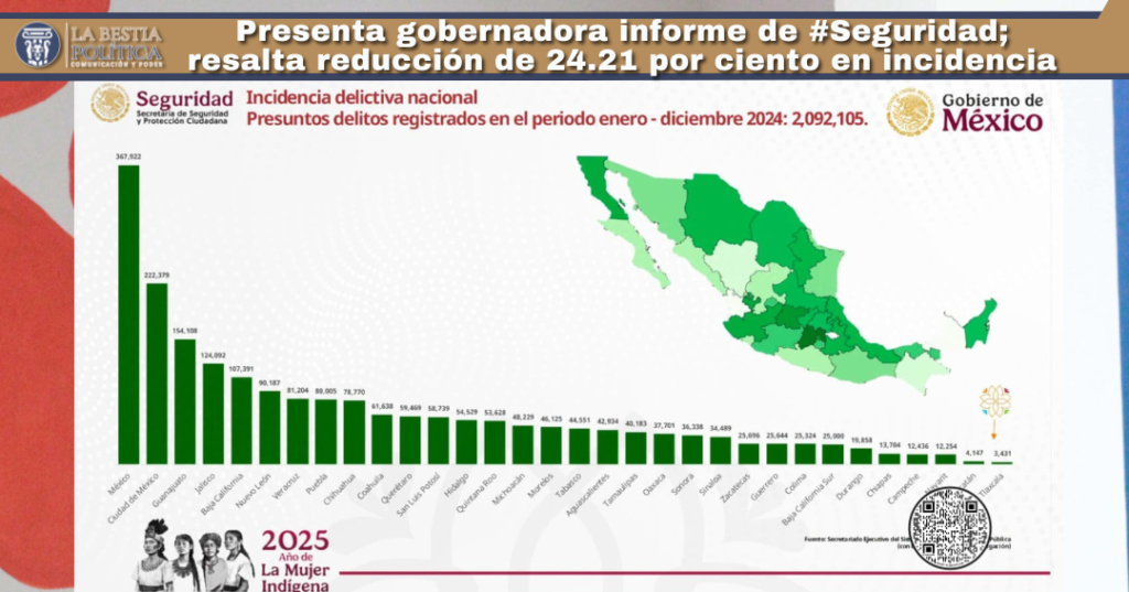 La gobernadora Lorena Cuéllar Cisneros presentó el Informe Anual de Incidencia Delictiva 2024 ante representantes de los sectores de la sociedad tlaxcalteca, el cual destacó que, en lo que va de su administración, la comisión de ilícitos ha disminuido en más de 24 por ciento, un logro histórico que reafirma el compromiso con la seguridad de las y los tlaxcaltecas.