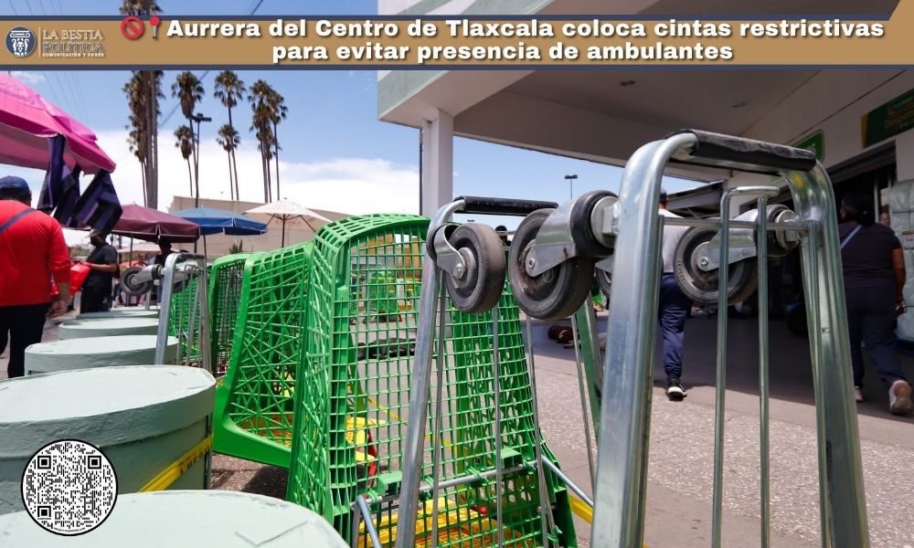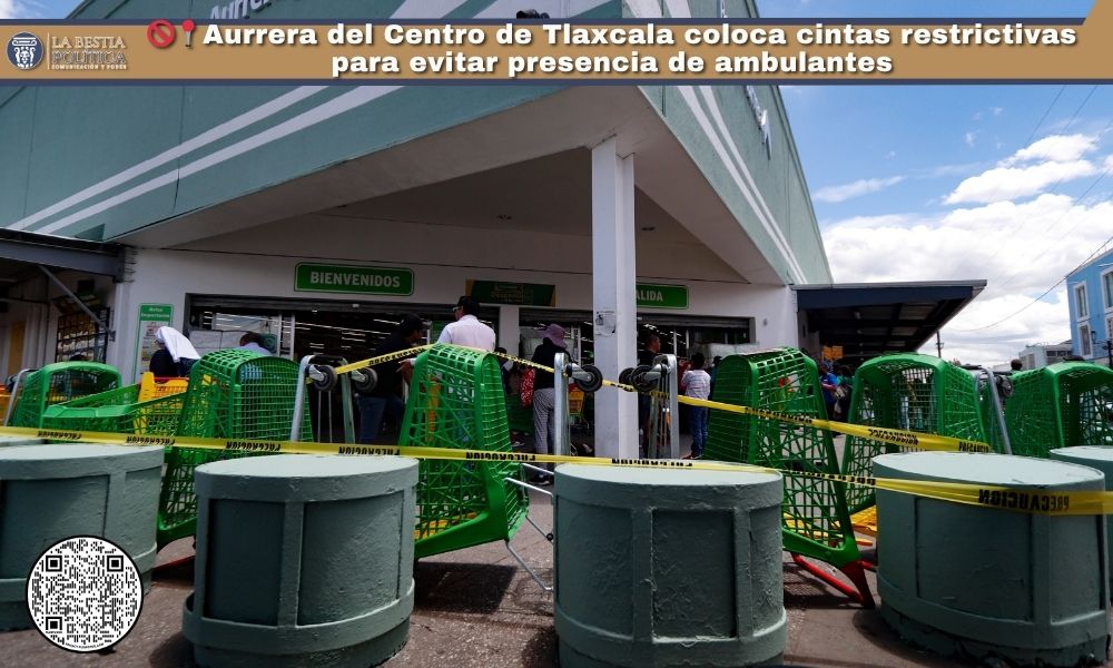 Las banquetas que rodean el supermercado Aurrera, ubicado en el corazón de Tlaxcala capital, amanecieron este martes con cintas restrictivas colocadas a lo largo de su perímetro. La medida, visiblemente implementada desde primeras horas del día, busca impedir la instalación de comerciantes ambulantes en la zona.