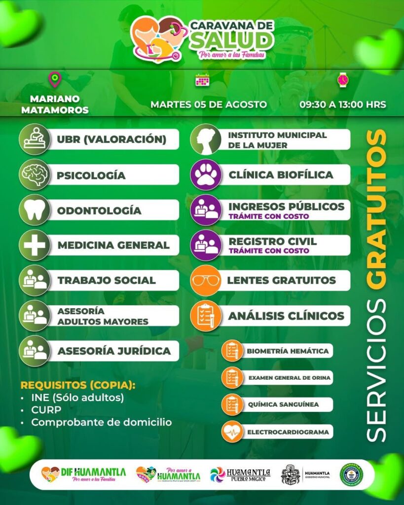 Con el compromiso de mejorar la calidad de vida de las familias, el Gobierno Municipal de Huamantla, que encabeza el alcalde Salvador Santos Cedillo, llevará este martes 5 de agosto la Caravana de Salud y Servicios a la comunidad de Mariano Matamoros, a través del Sistema DIF Municipal.
