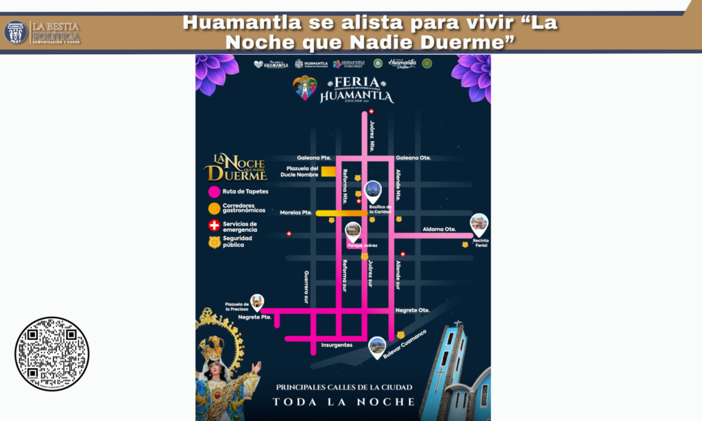 El presidente municipal reiteró la invitación a vivir esta fiesta con orgullo y en un ambiente de respeto y unión. “Queremos que sea una noche inolvidable para todas y todos, donde las calles de Huamantla se llenen de color, fe y tradición, siempre con seguridad para quienes nos visitan y para nuestra gente”, subrayó.