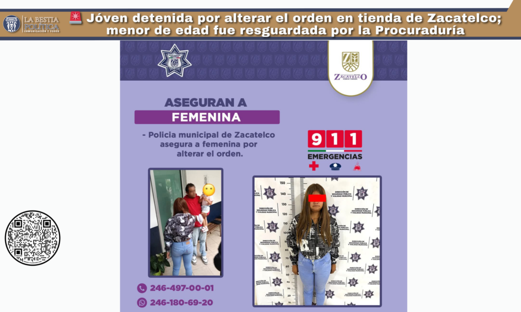 La joven se encontraba acompañada de una menor de aproximadamente 3 años, por lo que se solicitó la intervención de la Procuraduría Municipal para la Protección de Niños, Niñas y Adolescentes. La menor fue resguardada y entregada a las 17:06 horas a su abuelo materno, quien acreditó su parentesco con documentación oficial. El procedimiento se realizó en presencia de personal de la Procuraduría, incluida una psicóloga, para garantizar el bienestar físico y emocional de la niña.