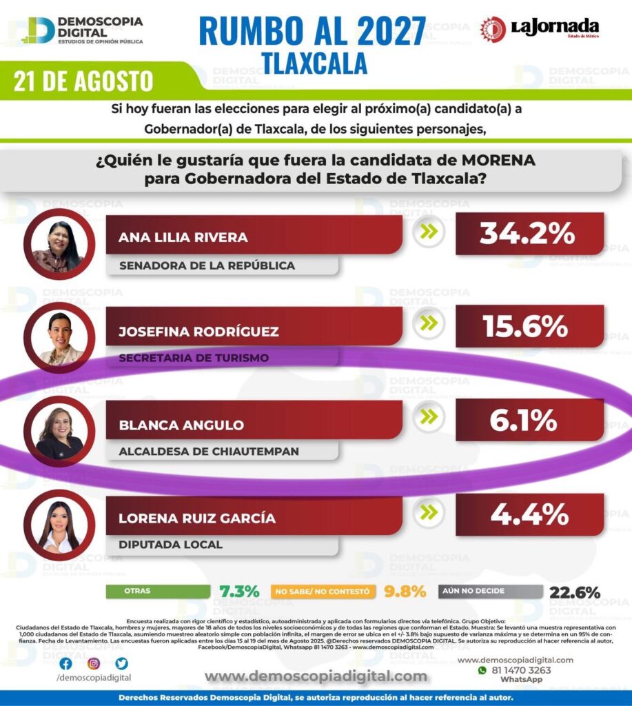 En los resultados arrojados por la encuesta realizada por la empresa Demoscopia Digital respecto a las preferencias para la gubernatura de Tlaxcala, a renovarse en 2027, se menciona a Blanca Angulo Meneses, presidenta de Chiautempan, quien es la única alcaldesa del estado que aparece dentro de las preferidas para ocupar el cargo.