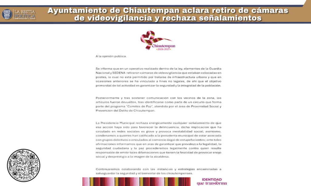 De acuerdo con la administración municipal, la finalidad de esta acción fue garantizar la seguridad y la integridad de la población. Tras entablar comunicación con vecinos de la zona, los equipos retirados fueron devueltos, al identificarse como parte de un circuito perteneciente al programa “Comités de Paz”, atendido por el área de Proximidad Social y Prevención del Delito de Chiautempan.