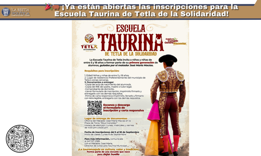 Tetla de la Solidaridad, Tlax., 5 de septiembre de 2025.– El Gobierno Municipal de Tetla anunció la apertura de inscripciones para la Escuela Taurina de Tetla, que por primera vez formará una generación de alumnos y alumnas de entre 5 y 18 años, quienes serán guiados por el reconocido matador José María Macías.