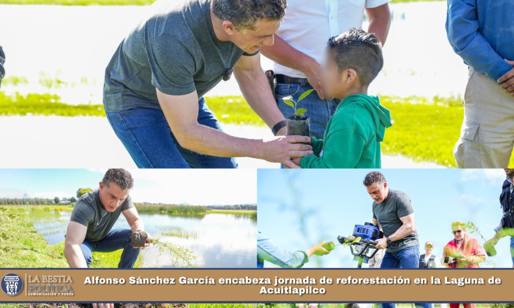 El presidente municipal de Tlaxcala, Alfonso Sánchez García, encabezó este martes una jornada de reforestación en la ribera de la Laguna de Acuitlapilco, acompañado por vecinos, asociaciones civiles, pescadores y voluntarios.
