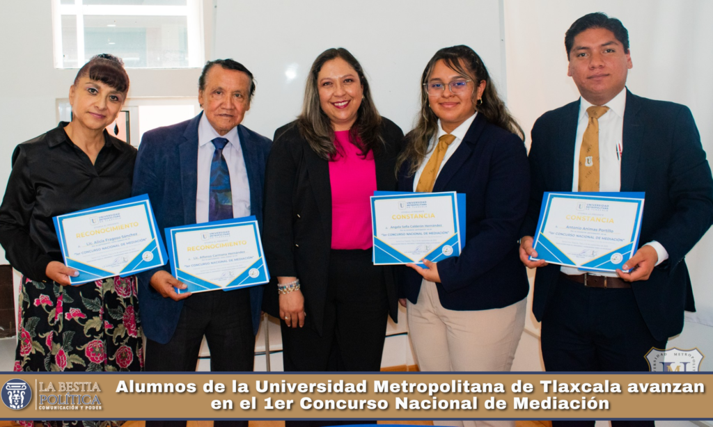 La Universidad Metropolitana de Tlaxcala (UMT) felicitó con orgullo a sus estudiantes Ángela Sofía Calderón Hernández, de séptimo semestre, y Antonio Ánimas Portillo, de quinto semestre, quienes lograron avanzar a la Fase Eliminatoria del 1er Concurso Nacional de Mediación, organizado por la Facultad de Derecho y Ciencias Políticas de la Universidad Autónoma de Tamaulipas (UAT).