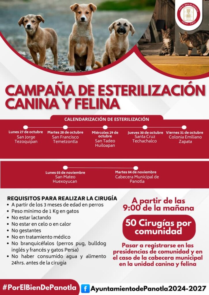 Con el compromiso de fomentar la tenencia responsable de mascotas y promover el bienestar animal, el H. Ayuntamiento de Panotla, encabezado por el presidente municipal Idelfonso Carro Roldán, dio inicio a la Campaña de Esterilización Canina y Felina 2025, en coordinación con la Secretaría de Salud del Estado de Tlaxcala.