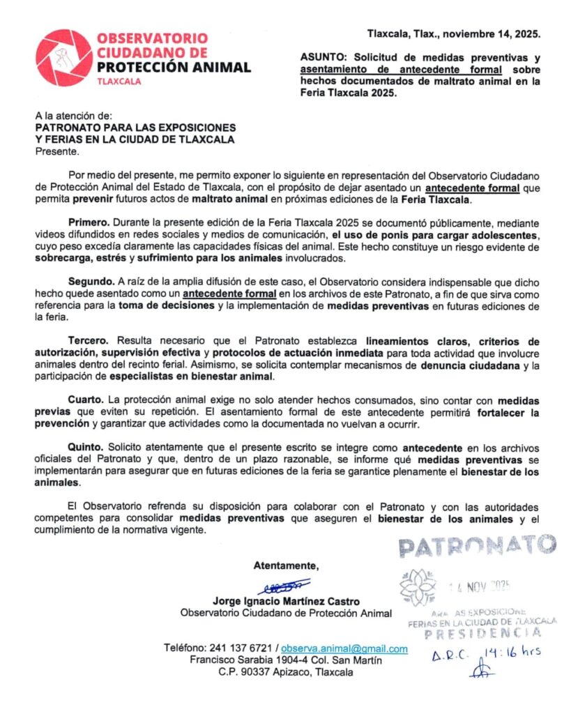 El Observatorio Ciudadano de Protección Animal (OCPA) informó que el pasado 14 de noviembre entregó un escrito oficial al Patronato para las Exposiciones y Ferias en la Ciudad de Tlaxcala, con el propósito de establecer un precedente institucional que fortalezca las acciones de supervisión, prevención y actuación en materia de bienestar animal durante las siguientes ediciones de la Feria de Tlaxcala.