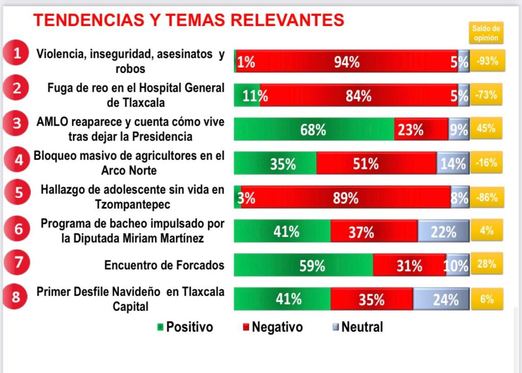 Mariana LOVERA// Un reporte de escucha digital realizado por la firma Impulso Mercadológico en Tlaxcala, correspondiente a la semana del 24 al 30 de noviembre de 2025, coloca a la violencia, inseguridad, asesinatos y robos como el tema que acaparó más del 35% de las conversaciones en plataformas como X, Facebook, Instagram y foros locales. Este tema, junto con la fuga de un supuesto reo en el Hospital General de Tlaxcala (21% de las menciones), representa más de la mitad del diálogo digital en el estado, marcado por un sentimiento ciudadano mayoritariamente crítico y preocupado.