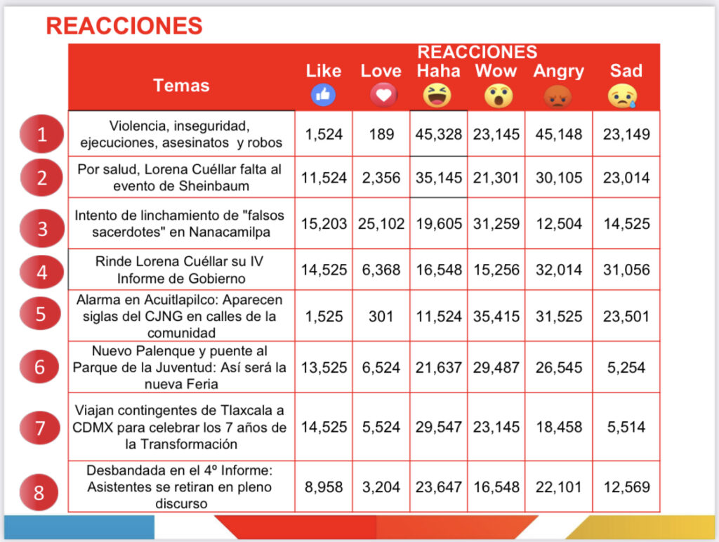 En cuanto a interacciones, el tema de la violencia lideró en reacciones de “Me enoja ” (45,148) y “Me entristece” (23,149). El intento de linchamiento en Nanacamilpa generó la mayor cantidad de “Me asombra” (31,259), mientras que el anuncio de la nueva Feria obtuvo un alto número de “Me encanta” (6,524).