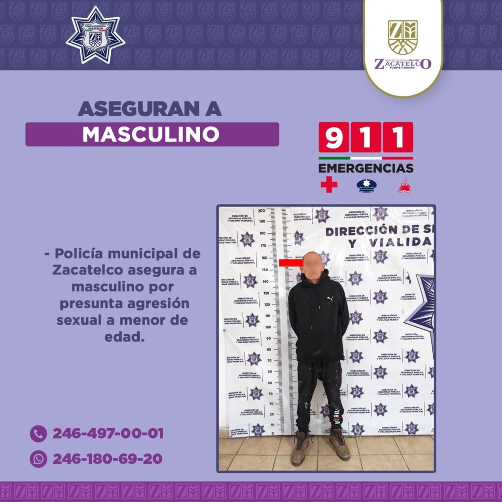 Elementos de la Policía Municipal de Zacatelco realizaron la detención de un masculino por su probable responsabilidad de tocamientos a una menor de edad, ocurrido la tarde del lunes 15 de diciembre de 2025 en la explanada del parque frente a la iglesia de Santa Inés, en la sección primera del municipio.