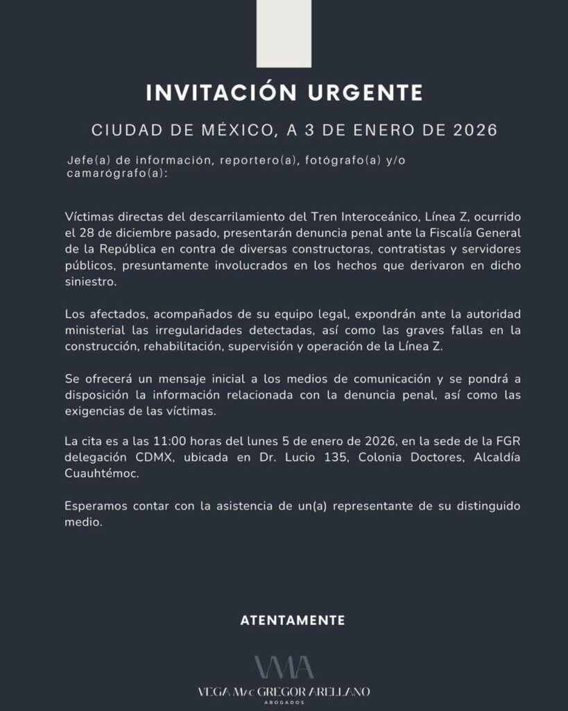 «Expondremos las irregularidades detectadas y las fallas en la supervisión que derivaron en este siniestro», menciona el documento. Las víctimas exigen que se transparente cómo se manejaron los contratos y por qué el sistema de seguridad ferroviaria no evitó el descarrilamiento.