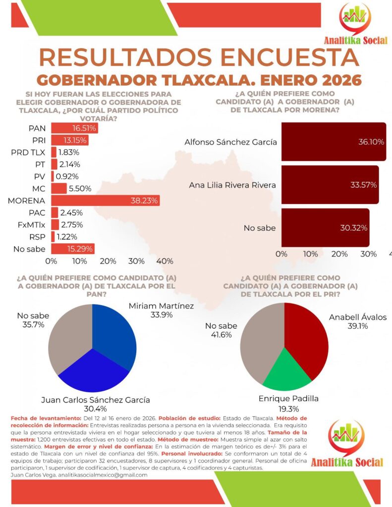 La encuesta fue aplicada mediante entrevistas cara a cara en viviendas, del 12 al 16 de enero de 2026, con una muestra de 1,200 casos en todo el estado de Tlaxcala y un margen de error de ±3 %, lo que respalda la solidez de los resultados.