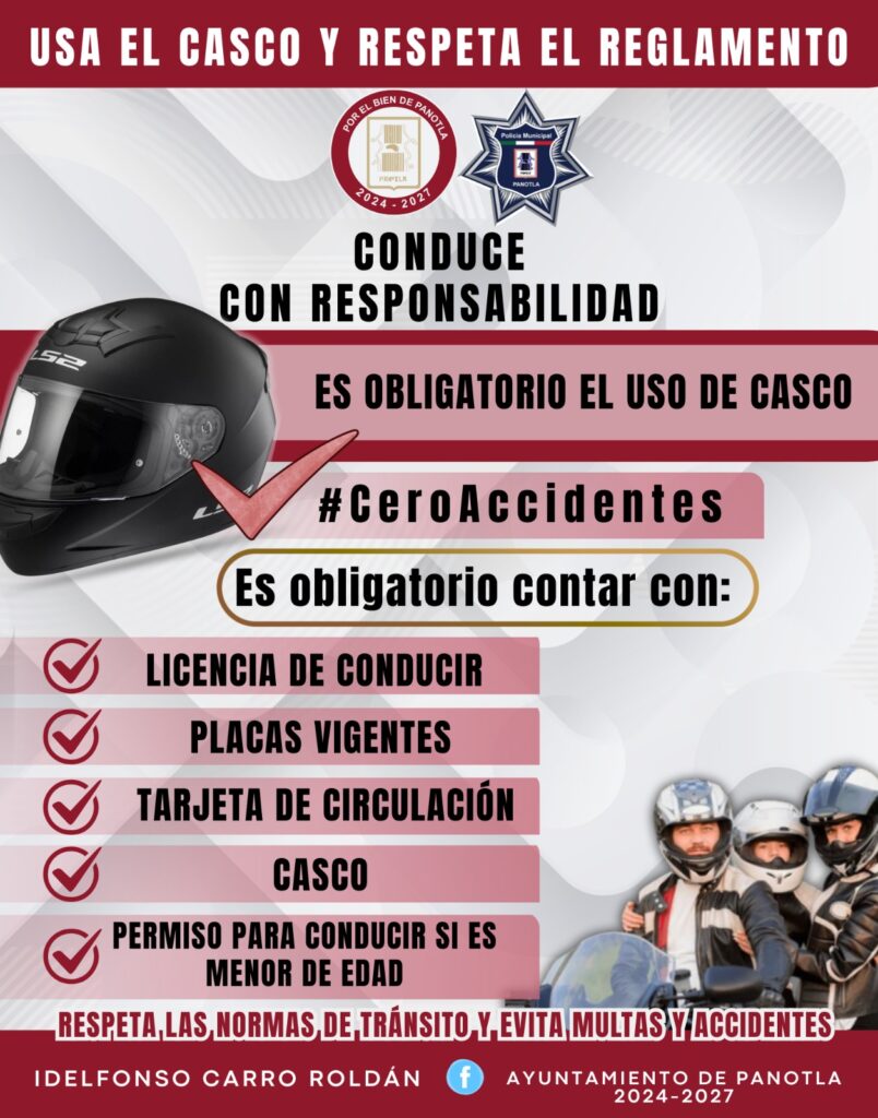 El Ayuntamiento de Panotla, a través de la Dirección de Seguridad Pública Municipal y Vialidad, informó que se llevarán a cabo revisiones continuas y permanentes a conductores de motocicleta en distintos puntos del municipio, como parte de las acciones para fortalecer la seguridad vial y prevenir accidentes.