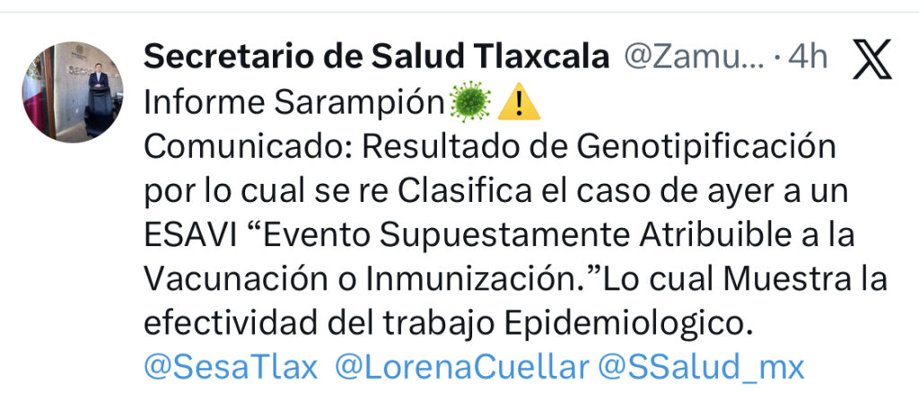 Mariana LOVERA// La Secretaría de Salud del Estado de Tlaxcala informa la rectificación del tercer caso presunto de sarampión anunciado previamente, tras concluir los análisis de laboratorio correspondientes. Los estudios de genotipificación confirmaron que el cuadro presentado por una bebé de seis meses de Huamantla corresponde a un Evento Supuestamente Atribuible a la Vacunación o Inmunización (ESAVI), descartándose así la transmisión activa del virus.