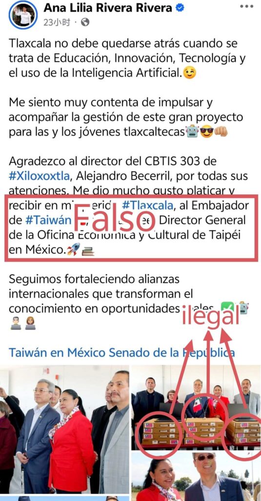 El comunicado hace referencia específica a la senadora Ana Lilia Rivera Rivera, quien en sus redes sociales agradeció la donación y se fotografió junto al director Lee, refiriéndose a él como «Embajador de Taiwán».