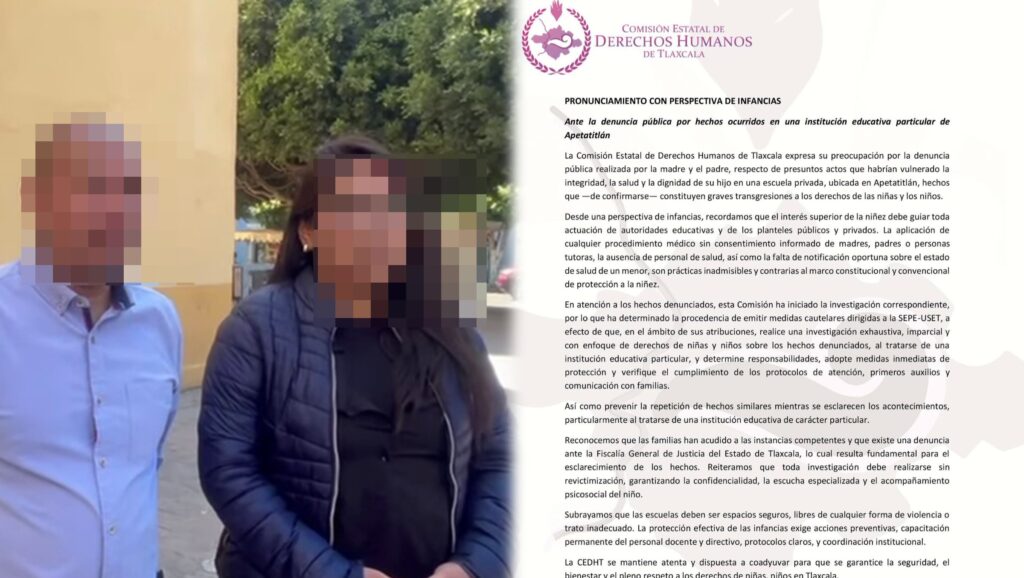 Ante la denuncia pública interpuesta por los padres de familia por presuntos actos que vulneraron la integridad, salud y dignidad de un menor en una institución educativa particular de Apetatitlán, la Comisión Estatal de Derechos Humanos de Tlaxcala (CEDHT) emitió un pronunciamiento y determinó medidas cautelares dirigidas a la SEPE-USET.