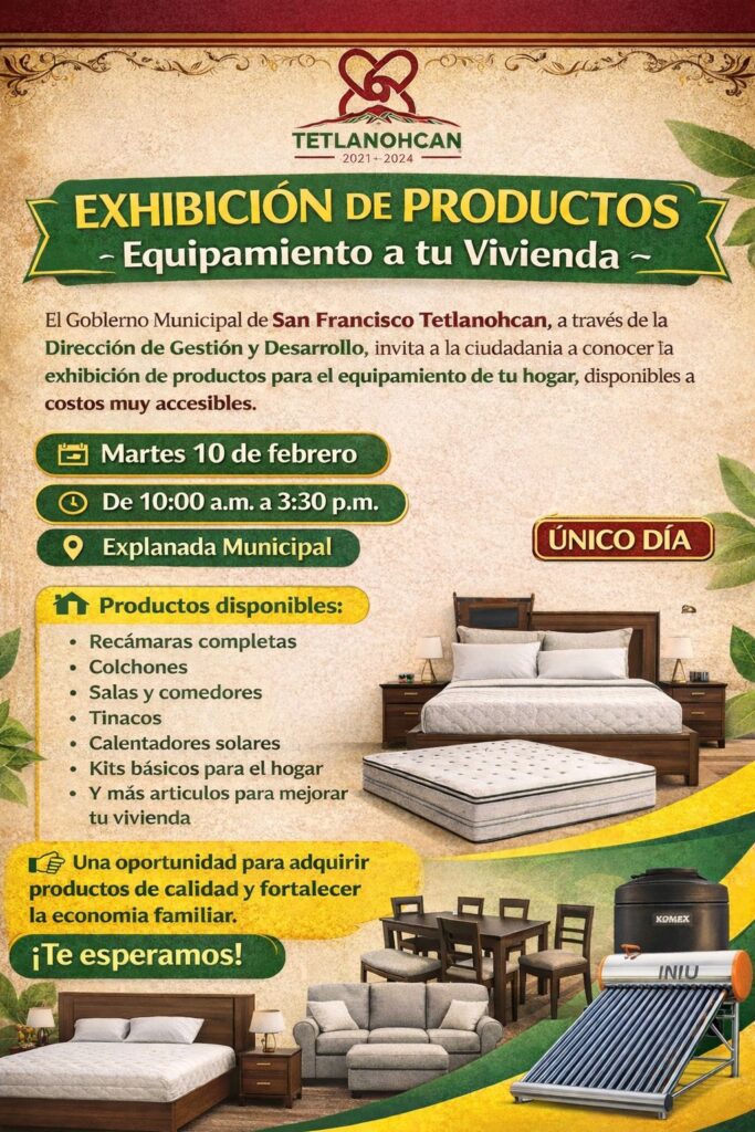 Con el objetivo de apoyar la economía familiar y mejorar las condiciones de los hogares, el Gobierno Municipal de San Francisco Tetlanohcan, encabezado por la presidenta municipal Kritsbey Pérez Flores, a través de la Dirección de Gestión y Desarrollo, invita a la ciudadanía a participar en la exhibición del programa “Equipamiento a tu Vivienda”.