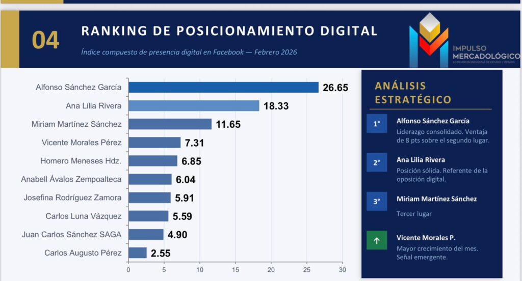 El ranking de posicionamiento digital del poder político coloca a Sánchez García a la cabeza con un 26 por ciento de las menciones y búsquedas, estableciendo una ventaja competitiva frente a otros actores políticos de la entidad.