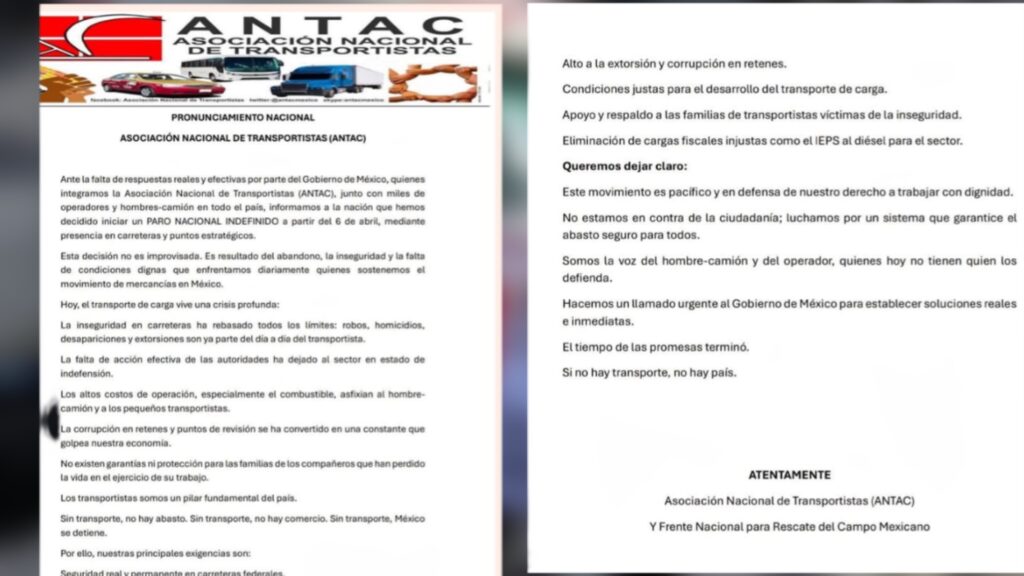 A través de un comunicado, la Asociación Nacional de Transportistas (ANTAC) señala textualmente que la decisión del paro “no es improvisada” y que es resultado “del abandono, la inseguridad y la falta de condiciones dignas” que enfrentan quienes sostienen el movimiento de mercancías en México.