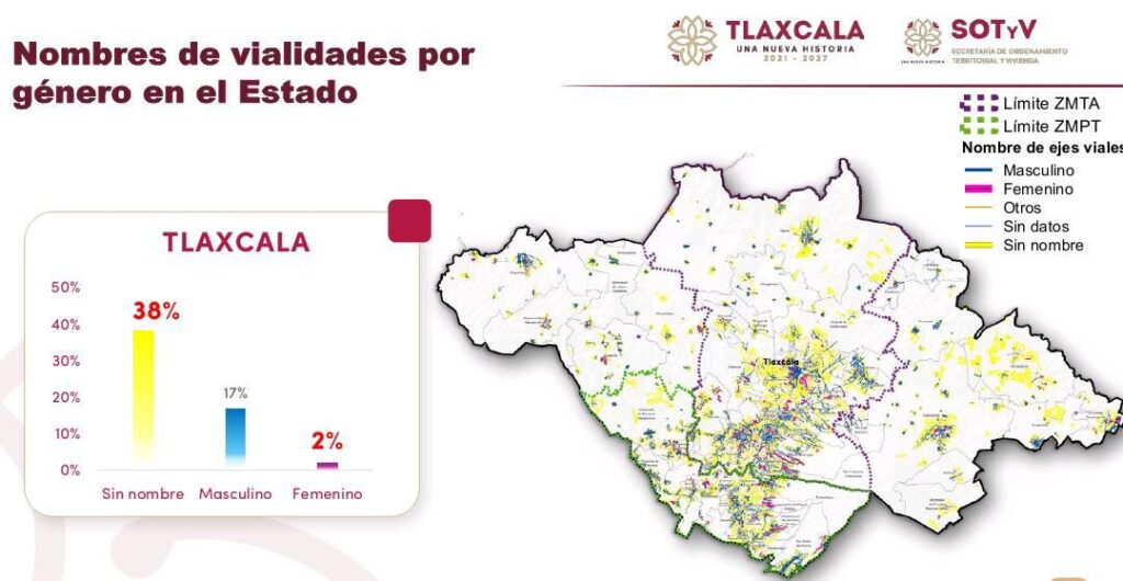 El diagnóstico estatal evidencia una brecha significativa: de las 37 mil 418 vialidades registradas en Tlaxcala, apenas el 2 por ciento cuenta con nombres femeninos, mientras que el 17 por ciento corresponde a denominaciones masculinas y un 38 por ciento ni siquiera tiene asignado un nombre.