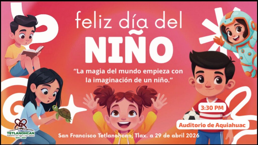 Con motivo del Día del Niño y la Niña, el Gobierno Municipal de Tetlanohcan invita a las niñas y los niños del municipio a disfrutar de una tarde llena de alegría, sorpresas y diversión, este miércoles 29 de abril en el Auditorio de Aquiahuac.
