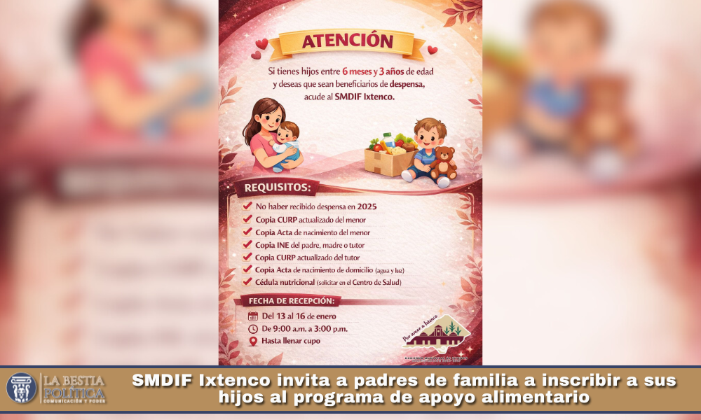 SMDIF Ixtenco invita a padres de familia a inscribir a sus hijos al programa de apoyo alimentario.