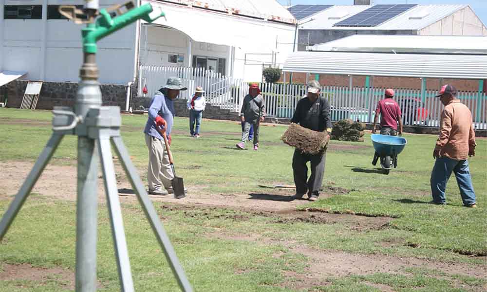 Dan mantenimiento a campo de fútbol del Próspero Cahuantzi en Chiautempan.