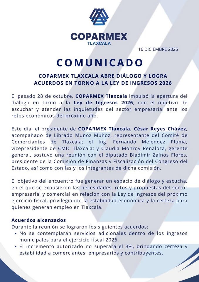 Logra COPARMEX Tlaxcala acuerdos clave para brindar certeza al sector empresarial