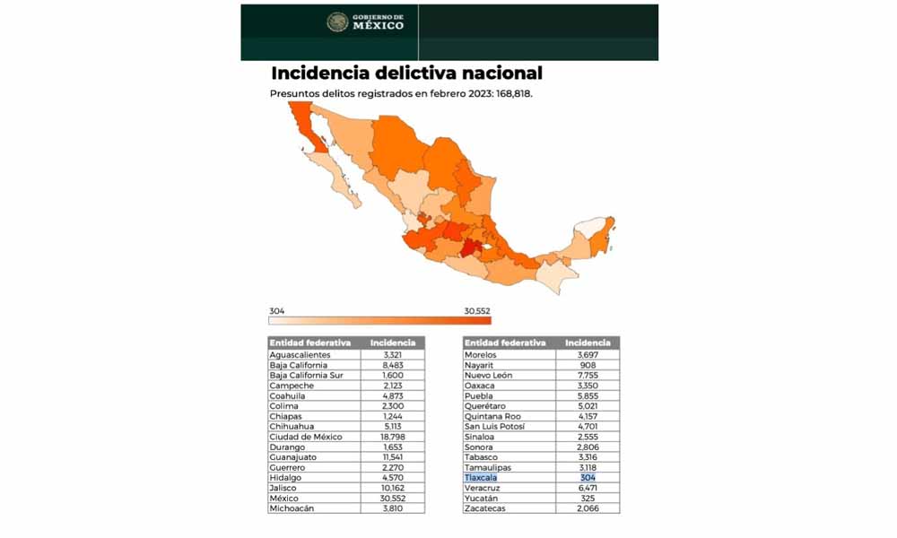 Ocupó Tlaxcala primer lugar con menor incidencia delictiva en el país durante febrero