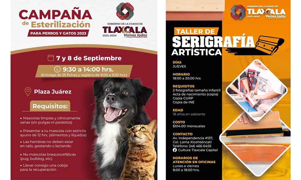 1.- ¡Nuevas fechas para esterilizar a perros y gatos! Aprovecha la campaña; el procedimiento es gratuito. #VamosTodos 2.- ¡Iniciamos nuevo grupo en el taller de serigrafía artística! Requisitos: – 2…