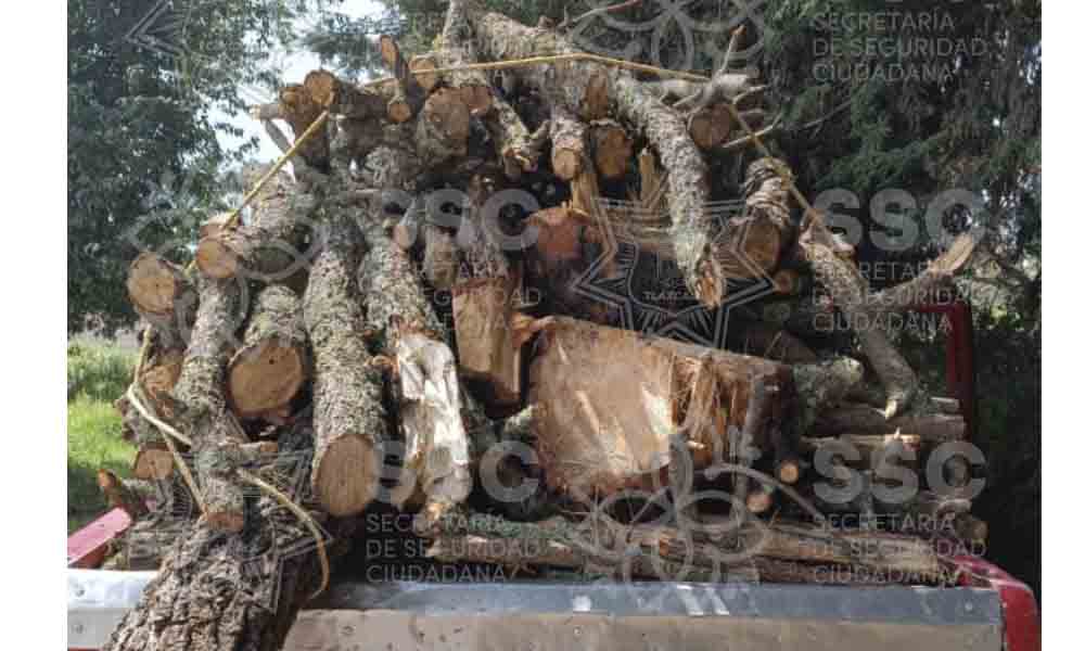 Durante un recorrido de seguridad y vigilancia, personal de Policía de Montaña, perteneciente a la Secretaría de Seguridad Ciudadana (SSC), aseguró un vehículo cargado con material forestal en el municipio de San José Teacalco.
