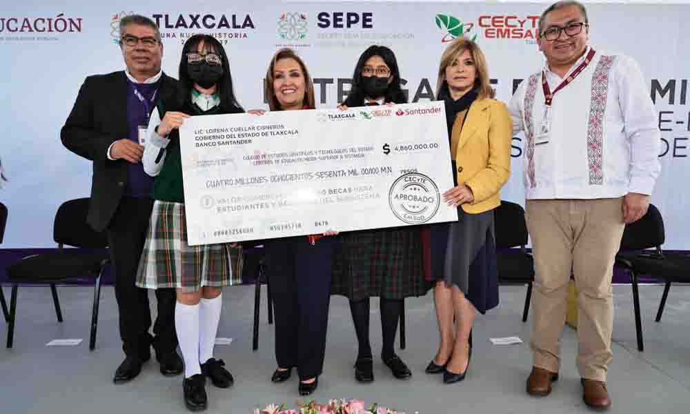 La gobernadora Lorena Cuéllar Cisneros entregó becas Santander y equipamiento a la comunidad estudiantil de distintos planteles del Colegio de Estudios Científicos y Tecnológicos del Estado y de los centros de Educación Media Superior a Distancia (Cecyte-Emsad) de Tlaxcala, con el objetivo de fortalecer sus habilidades tecnológicas y académicas.