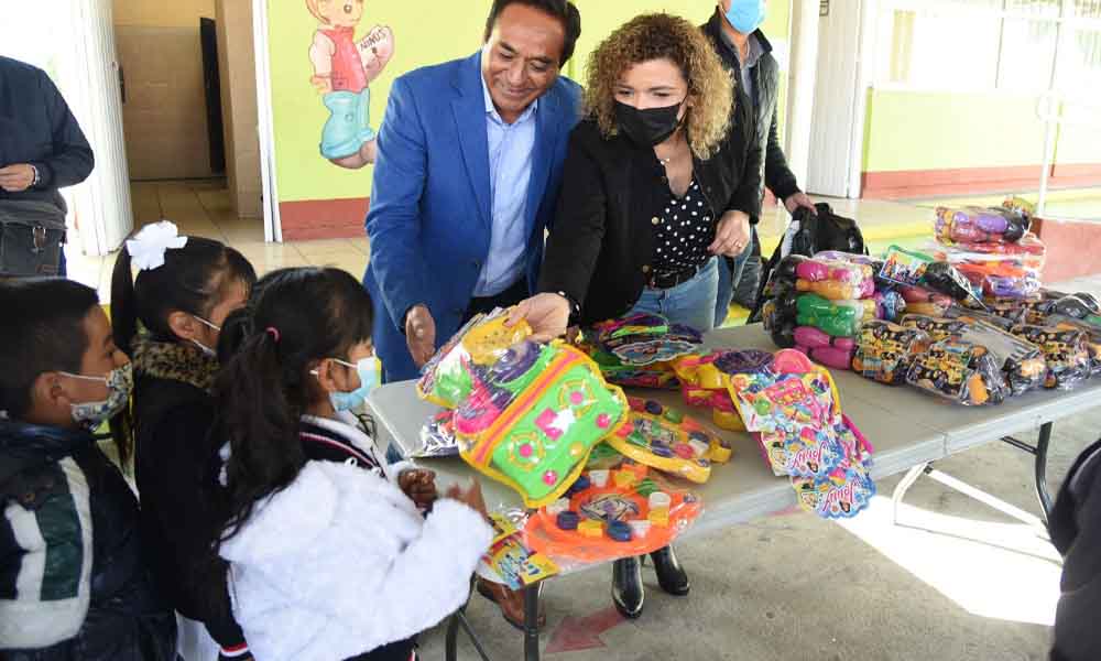 Las y los alumnos del jardín de niños “Jaime Torres Bodet” de la comunidad de Atlahapa, recibieron de manos del alcalde, Jorge Corichi, y su esposa, la presidenta honoraria del Sistema DIF Municipal, Cecilia Herrejón, obsequios de parte de los Reyes Magos.