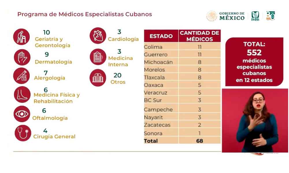 Agregó que de 552 médicos especialistas cubanos que se estarán integrando a los servicios médicos de 12 estados, el viernes 27 de enero arribaron 68 especialistas de los cuales ocho llegaron a Tlaxcala y en los próximos meses se integrarán más a los 10 hospitales IMSS–Bienestar.