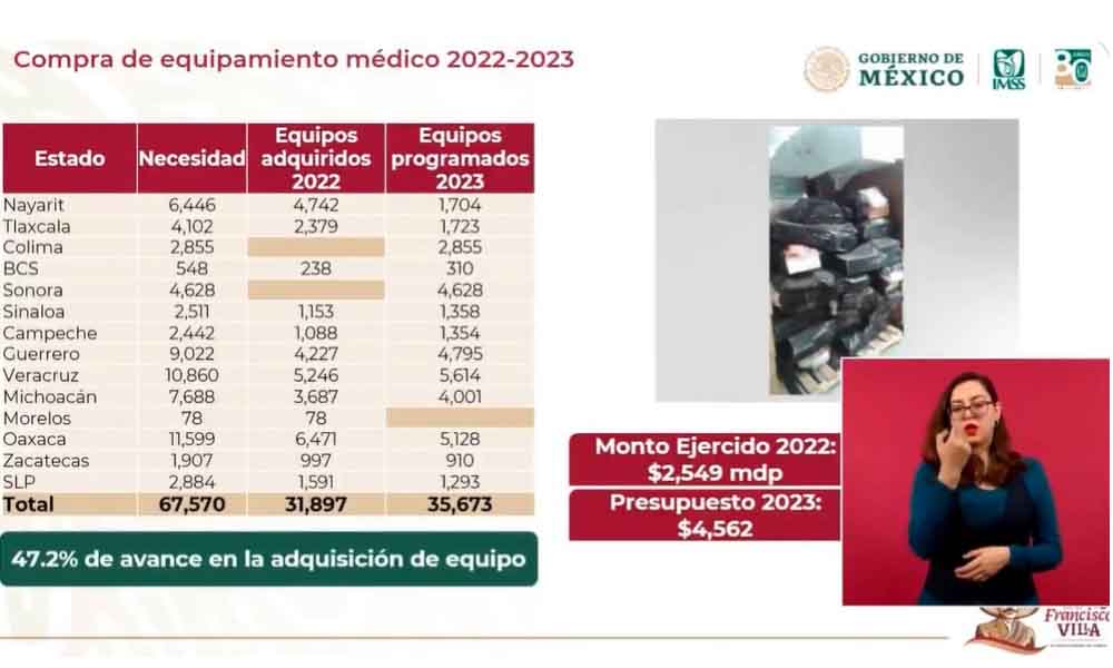 En la compra de equipamiento médico entre 2022 y 2023, Robledo Aburto indicó que 14 estados que iniciaron en el año pasado con la implementación de IMSS–Bienestar, presentaron una necesidad de 67 mil 570 equipos, durante 2022 se compraron 31 mil 897 equipos y para 2023 se tiene programado adquirir 35 mil 673 equipos medicinales, del equipamiento médico a comprar, mil 723 corresponden al estado de Tlaxcala.