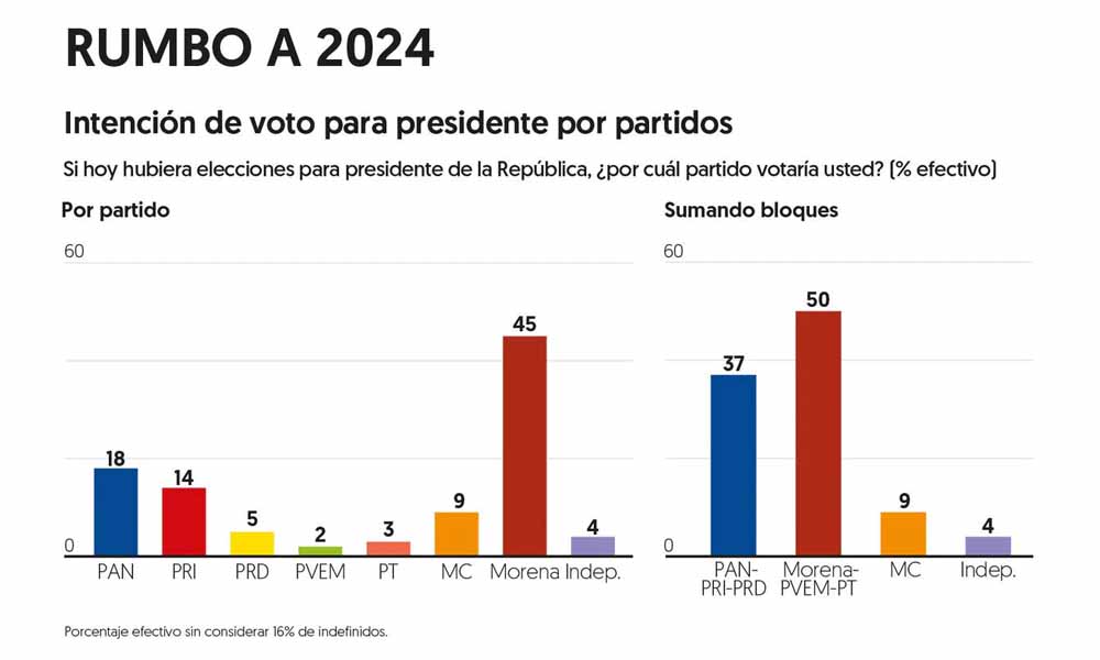 Morena y sus aliados captaron en febrero 50 por ciento de intención de voto efectiva rumbo a las elecciones presidenciales de 2024, según revela la encuesta nacional de EL FINANCIERO realizada en ese mes.