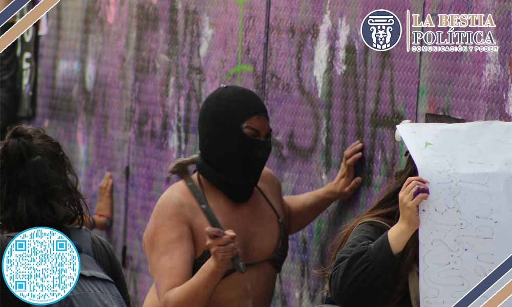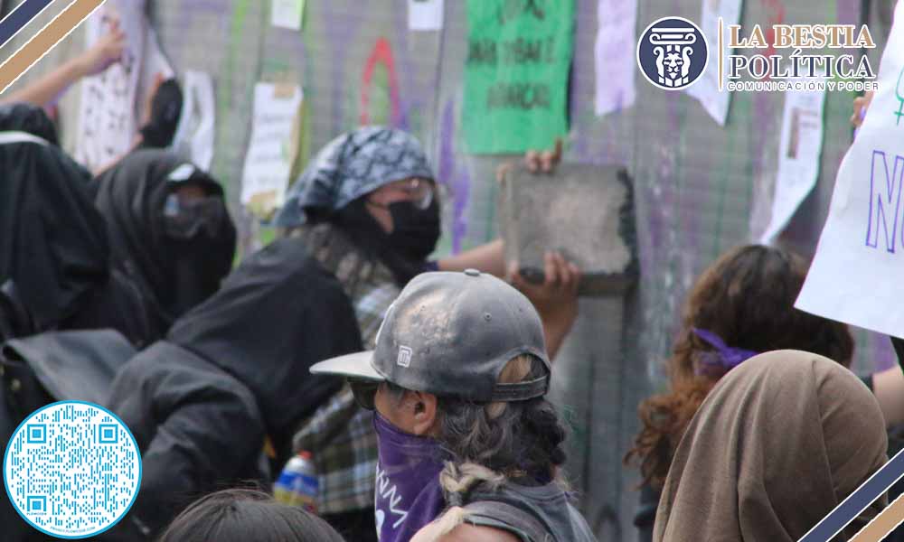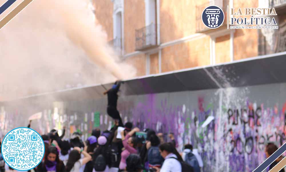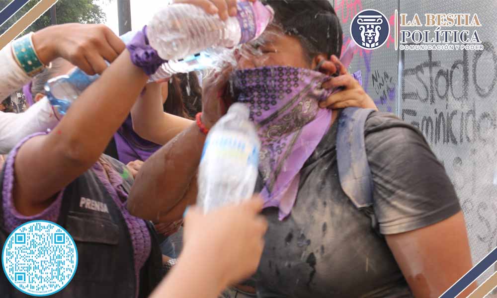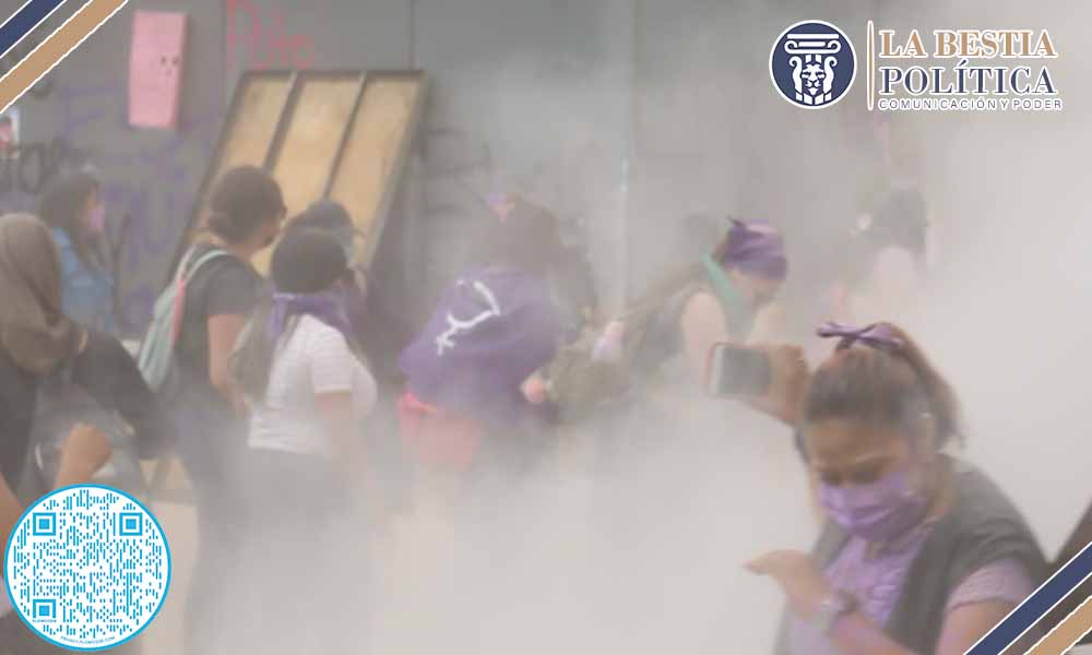 Los rostros de policías asomaban de entre las murallas metálicas para arrojar gas de extintores para repeler a las jóvenes que lanzaban piedras a los vidrios de Palacio de Gobierno, mientras desde la azotea eran lanzadas bombas con gas lacrimógenos hacia las manifestantes, cuando estaban a punto de derribar el cerco.