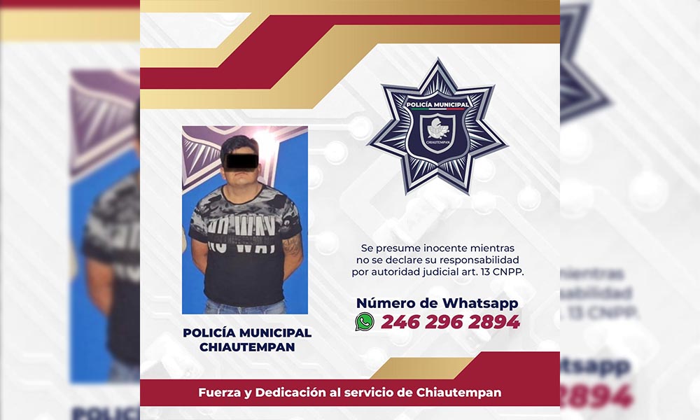 Elementos del Grupo de Operaciones Tácticas (GOT) de la Dirección de Seguridad Pública Municipal, Vialidad y Protección Civil de Chiautempan, detuvieron a un sujeto por daños a domicilio particular y por violación sexual en agravio a una mujer.