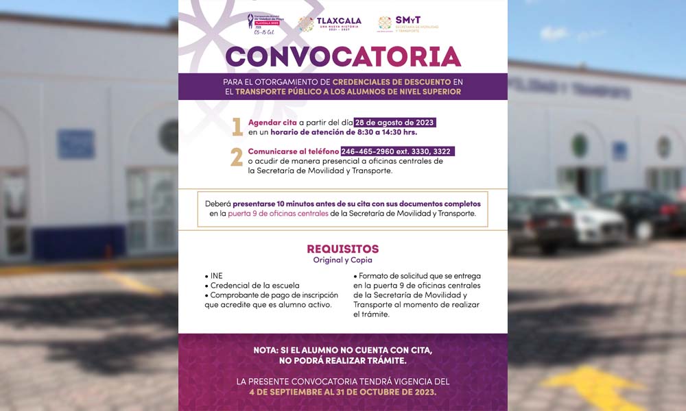 La Secretaría de Movilidad y Transporte (SMyT) abre la convocatoria para que los estudiantes de nivel superior que acuden a escuelas públicas en el estado tramiten la credencial de descuento para el uso del transporte público, por lo que a partir de este lunes 28 de agosto podrán agendar su cita.