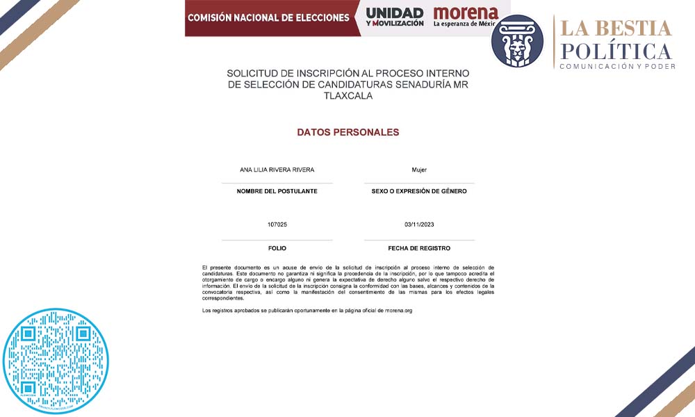 «Tal y como lo establece nuestra convocatoria y de acuerdo a mis convicciones y principios, acabo de presentar mi aspiración a la reelección por morena al Senado de la República. Estoy consciente de que el pueblo de Tlaxcala decidirá mi destino. Un fuerte abrazo», escribió la actual presidenta de la mesa directiva del Senado.