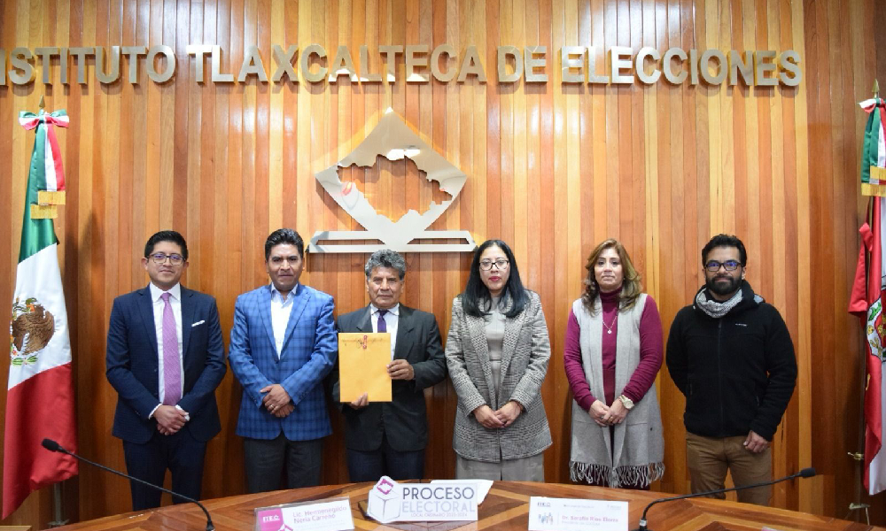 Integrantes de la Comisión de Organización Electoral, Capacitación y Educación Cívica del ITE recibieron el instrumento de manos de Serafín Ríos Elorza, Presidente del Coltlax, instancia encargada de diseñarlo.