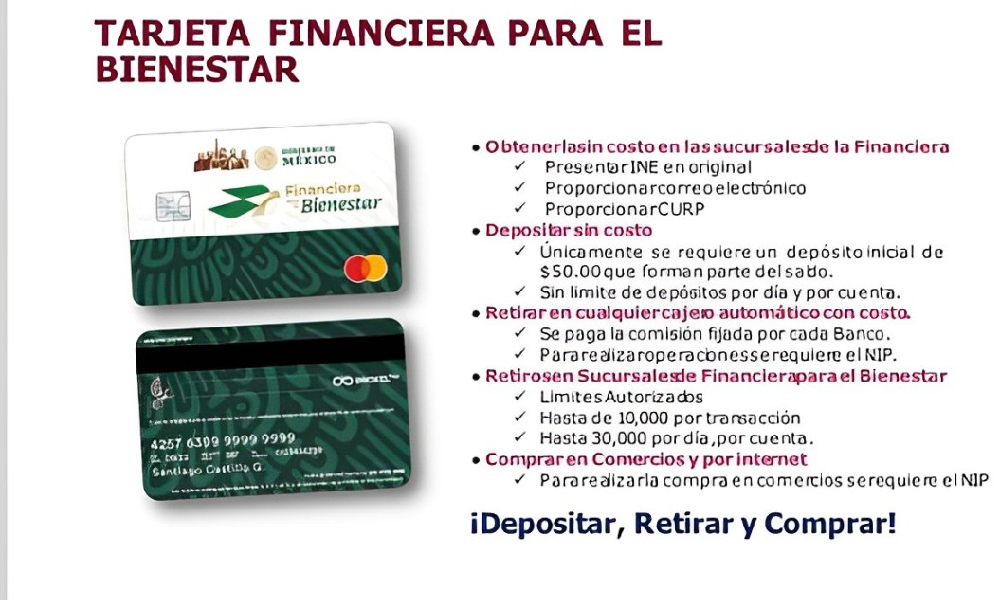 Entre los beneficios de la tarjeta financiera para el bienestar, realizar el envío de remesas remesas de dos mil 500 dólares por 3.99 dólares de comisión, además De CETES directos a una taza de 10 por ciento anual.