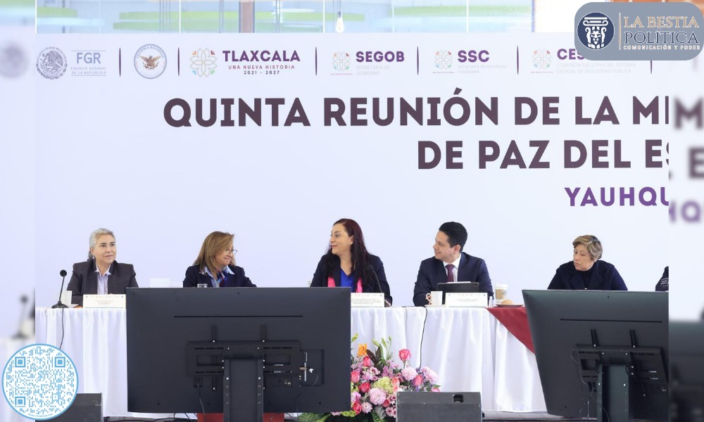 La gobernadora Lorena Cuéllar Cisneros encabezó este viernes la quinta reunión de la Mesa Interregional de Paz en Tlaxcala, en la que participó Martha Beatriz López López, representante de la Secretaría de Seguridad y Protección Ciudadana federal (SSPC), integrantes del gabinete de seguridad estatal y los 60 presidentes municipales.