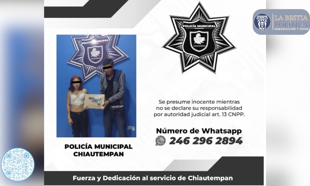 Ambas personas fueron trasladadas a la Dirección de Seguridad Pública Municipal, Vialidad y Protección Civil de Chiautempan para los efectos legales correspondientes, cabe mencionar que la parte afectada descartó proceder legalmente, por lo cual, el hombre y la mujer, identificados como Iván N., y Jaqueline N., fueron puestos a disposición ante la Procuraduría General de Justicia del Estado (PGJE) para lo conducente por el presunto delito de cohecho y portación ilegal de arma de fuego.
