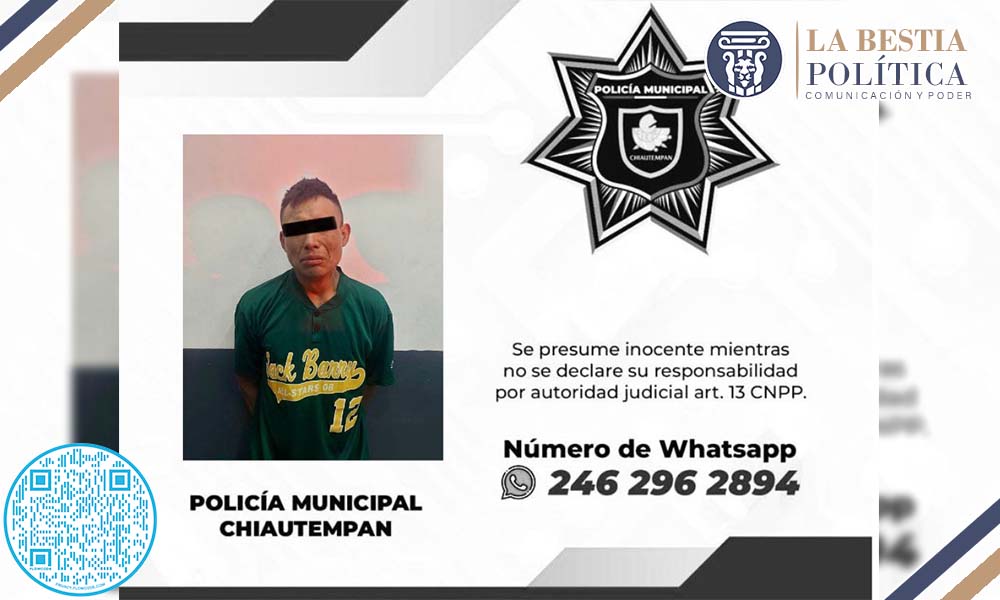 La Dirección de Seguridad Pública Municipal, Vialidad y Protección Civil de Chiautempan detuvo a un masculino por señalamientos directos referentes a la comisión de diversos delitos y por infringir el Bando de Policía y Gobierno.