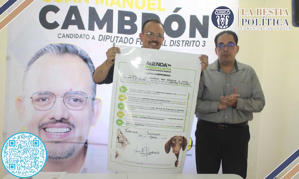 Como parte del Pacto Animalista, Juan Manuel Cambrón trabajará para promover y apoyar iniciativas legislativas que penalicen el maltrato animal de manera efectiva, así como la creación de refugios y centros de rehabilitación para animales maltratados o abandonados, pero sobre todo el que legalmente se reconozca que los animales son seres sintientes, entre tantas otras cosas.
