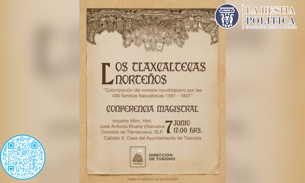 Los Tlaxcaltecas Norteños🚶🏽♂️➡️ Conferencia Magistral Imparte Mtro. Hist. José Antonio Rivera Villanueva Cronista de Tierranueva, SLP. 7 de junio 17:00 hrs. Cabildo II, Casa del Ayuntamiento de Tlaxcala “Colonización del noreste novohispano por las 400 familias tlaxcaltecas 1951 – 1801” #CiudadColonial #ArquitecturaColonial #VisitaTlaxcala #VisitaCapitalTlaxcala #visitméxico #visittlaxcala Navegación de entradas Campaña de esterilización de perros y gatos en la plaza Xicohténcatl de Tlaxcala capital A todos los propietarios y/o encargados de establecimientos comerciales con giro en venta de bebidas alcohólicas en general del municipio de Tlaxcala.